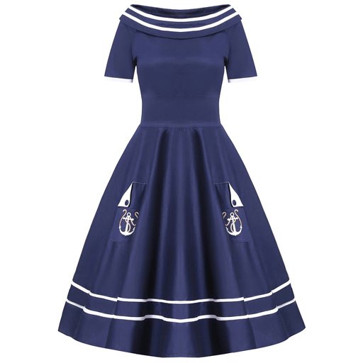 Swingkleid in Navyblau mit weissen Anker-Details U-Boot-Kragen mit zwei Zierknöpfen Verdeckter Reissverschluss seitlich Material: 97% Baumwolle, 3...