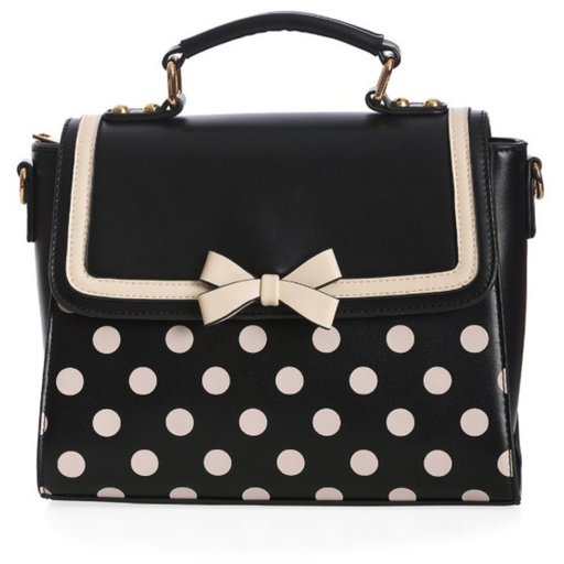 Retro-Tasche in Schwarz mit weissen Tupfen süsse weisse Schleife auf der Vorderseite abnehmbarer Trageriemen Masse: 26 x 22 x 11 cm Material: aus...