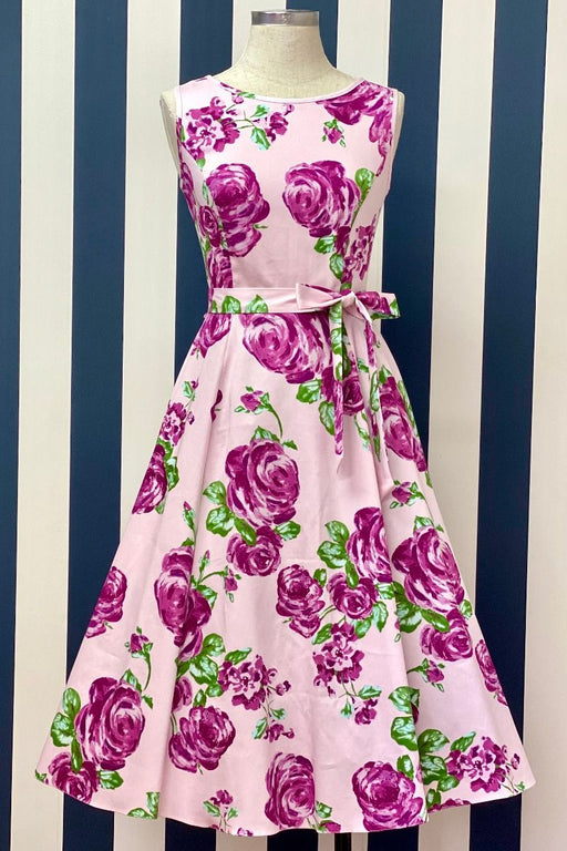 Swingkleid mit lila Rosen auf zartrosa Hintergrund Verdeckter Reissverschluss hinten Gürtel aus Stoff,Gürtelschlaufen Material: 97% Baumwolle, 3% E...