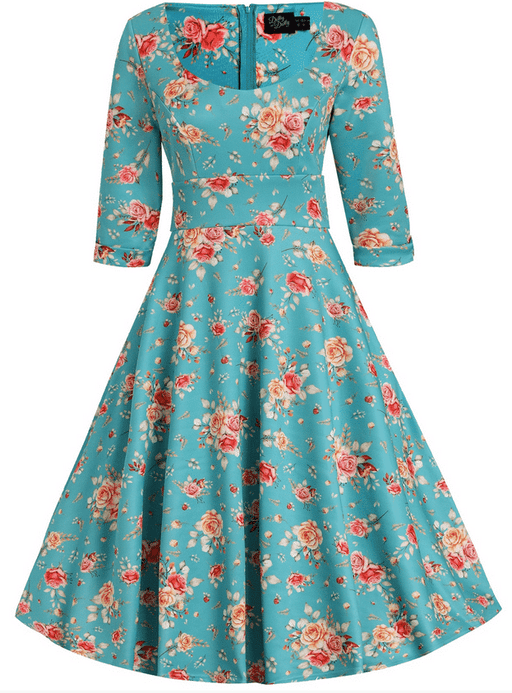 Himmelblaues Swingkleid mit Rosendruck grosser Sweetheart-Ausschnitt Dreiviertel-Ärmel versteckte seitliche Eingrifftaschen versteckter Reissversch...