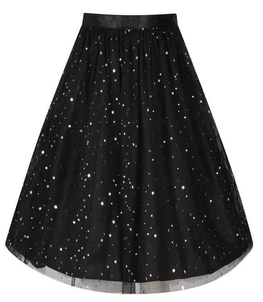 Festlicher schwarzer Swingrock mit Goldsternchen und Tupfen zweilagig: Aussenseite aus Tüll Reissverschluss hinten Material: 100% Polyester Hier f...