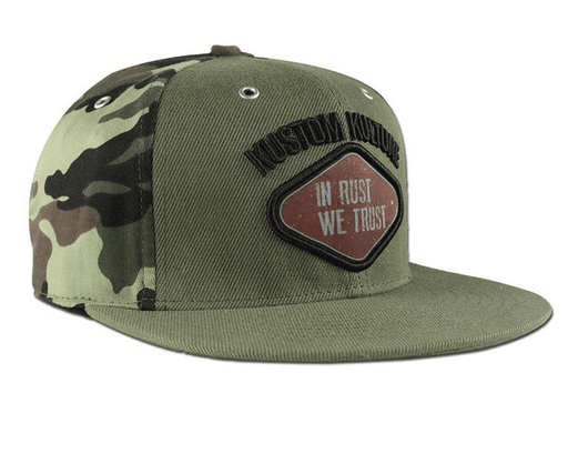 Cap in Camouflage-Optik mit Patch "IN RUST WE TRUST" Stickerei Patch mit Aufschrift vorne Verstellbarer Kunststoff-Verschluss hinten Material: 100%...
