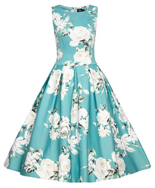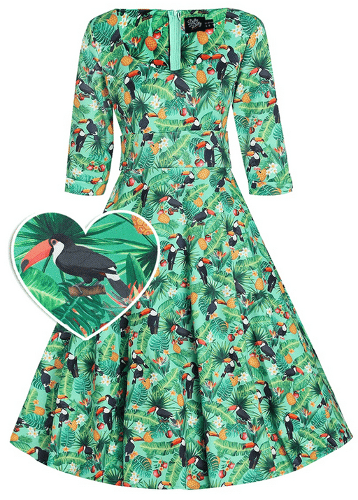 Grünes Swingkleid mit tropischen Motiven grosser Sweetheart-Ausschnitt Dreiviertel-Ärmel versteckte seitliche Eingrifftaschen versteckter Reissver...