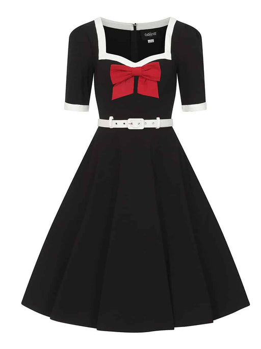 PREIS HALBIERT! Weit schwingendes schwarzes Retrokleid weiss umrundeter Ausschnitt und Ärmelenden rote abnehmbare Schleife schmaler weisser Gürtel...