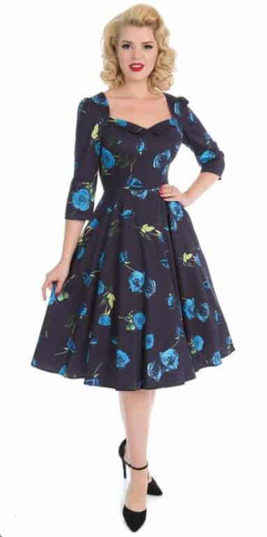 Weit schwingendes Kleid in Dunkelblau mit elegantem Rosenprint Sweetheart-Ausschnitt 3/4-Ärmel seitliche Eingrifftaschen versteckter Reissverschlus...