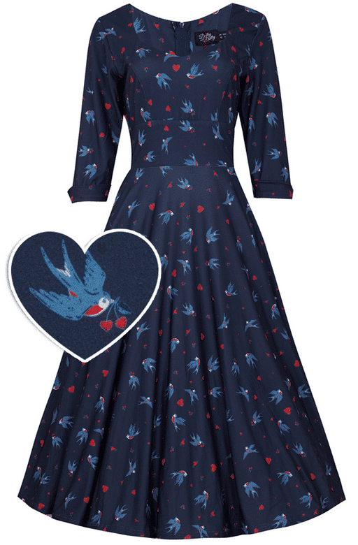Dunkelblaues Swingkleid mit Schwalben und Herzen grosser Sweetheart-Ausschnitt Dreiviertel-Ärmel versteckte seitliche Eingrifftaschen versteckter R...