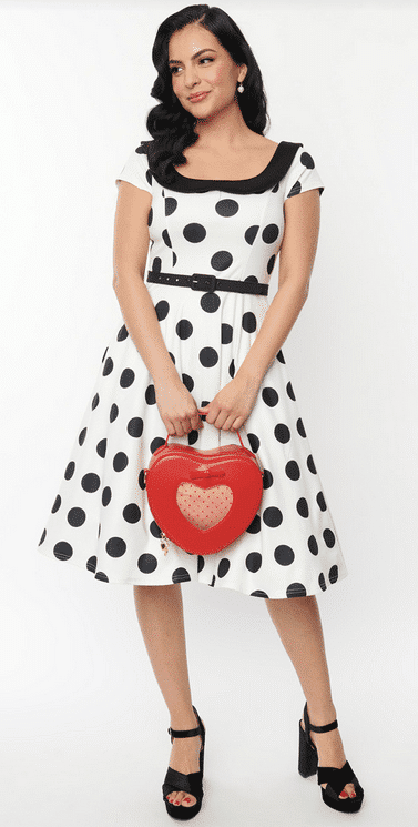 Swingkleid in Weiss mit grossen schwarzen Polka Dots geschwungener Ausschnitt mit schwarzem Kragen abnehmbarer schwarzer Gürtel mit Herzschnalle ve...