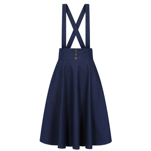 Ausgestellter Trägerrock aus stretchigem Jeansstoff Abnehmbare Träger Drei Knöpfe mit Ankermotiv Reissverschluss seitlich Material: 65% Baumwolle...
