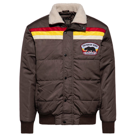 Braune Winterjacke im Retro-Stil Streifen in Rot, Gelb und Weiss sowie Patch auf der Brust Teddykragen, der auch als Stehkragen getragen werden ka...