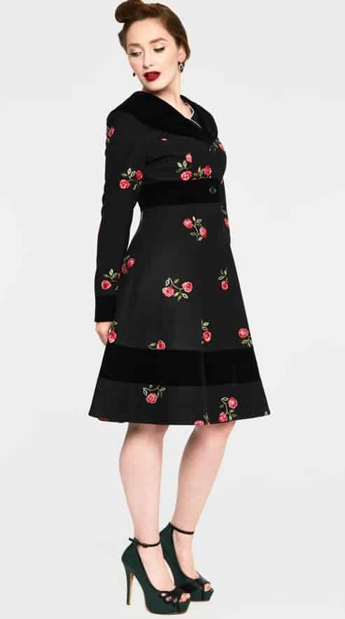 Schwarzer Retro-Mantel mit gestickten Rosen raffiniert eingesetzte Bahnen aus Samt Kragen und Ärmelenden aus Samt schwarze Knöpfe Material: 97% Bau...