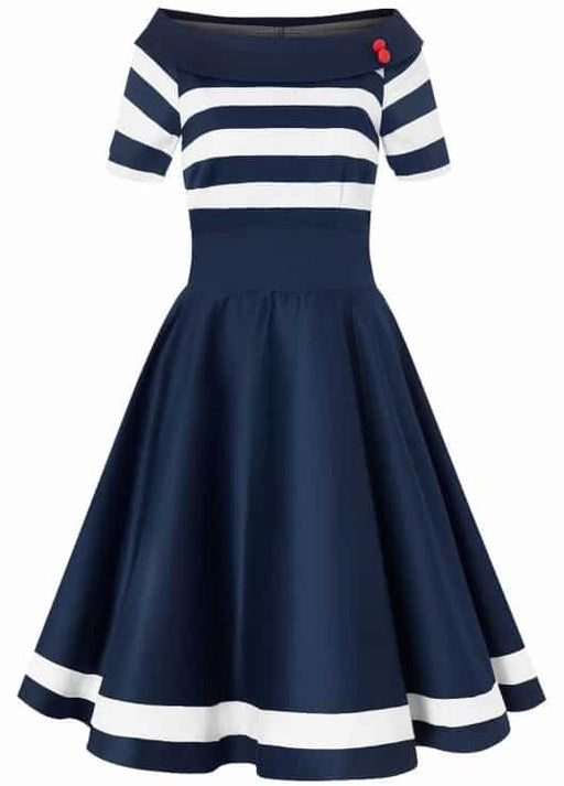 Swingkleid im Matrosenlook U-Boot-Kragen mit zwei kontrastierenden roten Zierknöpfen Oberteil in Weiss mit breiten navyblauen Streifen Rockteil in...