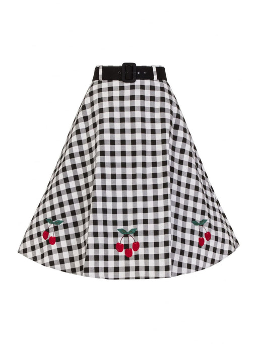 Weit schwingender Rock mit Karomuster und Kirschenmotiv aufgestickte Kirschen breiter Taillenbund mit Gürtel versteckter Reissverschluss Material: ...