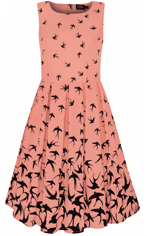 Swingkleid in hellem Lachsrosa mit schwarzen Schwalben Bootsausschnitt Reissverschluss hinten Satinstoff mit leichtem Stretch Material: 97% Polyest...