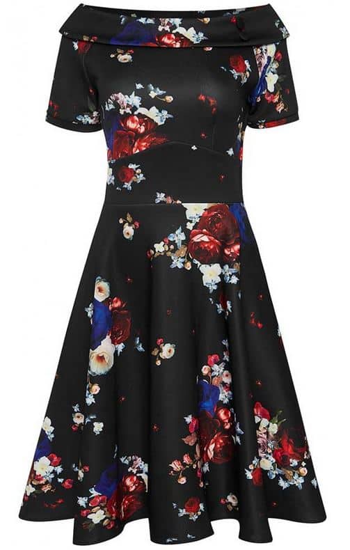 Weit schwingendes Kleid in Schwarz mit Rosenmuster U-Boot-Kragen Reissverschluss seitlich Material: 97% Polyester, 3% Elasthan Hier findest du pass...