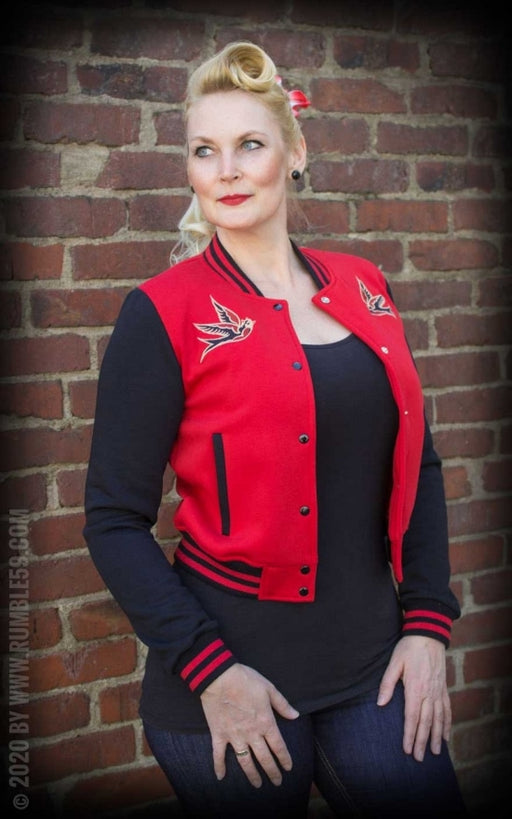 Baseballjacke mit Schwalben-Tattoo-Stickereien gestreifte Ripp-Bündchen an Ärmel und Saum Material: 65% Baumwolle, 35% Polyester