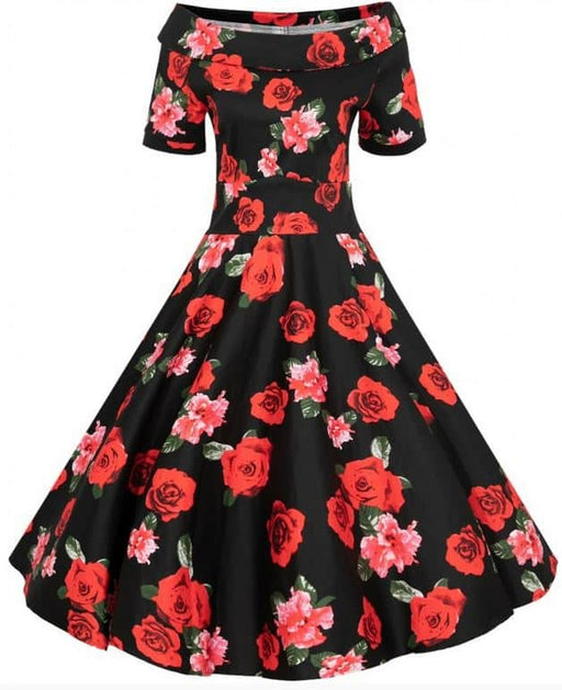 Weit schwingendes Kleid in Schwarz mit Rosenblüten in Rottönen U-Boot-Kragen Reissverschluss seitlich Material: 97% Polyester, 3% Elasthan Hier fin...