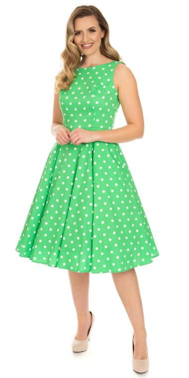 Swingkleid in hellem Grün mit weissen Tupfen Rundhalsausschnitt versteckter Reissverschluss seitlich seitliche Eingrifftaschen Material: 97% Baumwo...