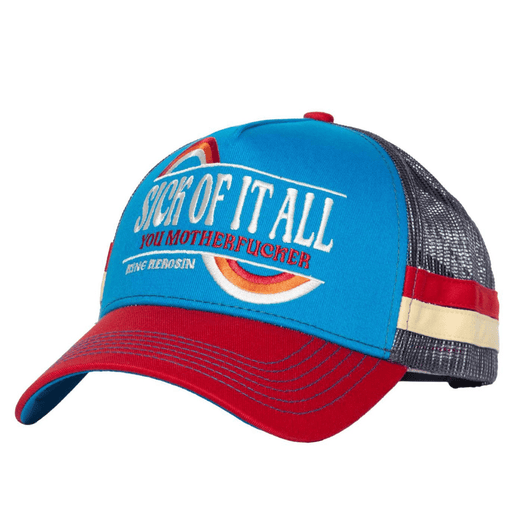 Trucker- Cap mit Statement-Stickerei "SICK OF IT ALL YOU MOTHERFUCKER" gebogener Schirm mit hellblauen Kontrastnähten kräftige Farbkombi aus Blau,...