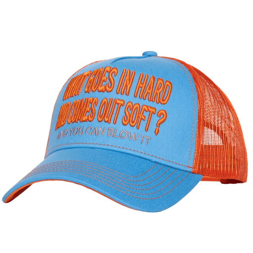 Trucker- Cap mit hochwertiger, witziger Stickerei gebogener Schirm mit orangen Kontrastnähten 7-Loch-Verschluss hinten individuell verstellbar Mat...