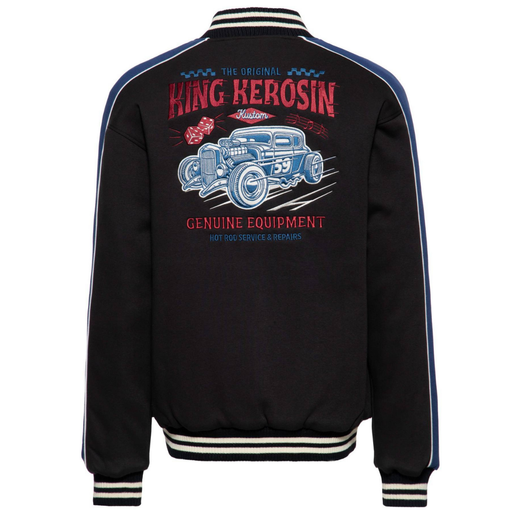 Gefütterte Collegejacke mit grosser Hotrod-Artwork-Rückenstickerei Ärmel mit Blockstreifen und elastischen Bündchen Brustpatch mit gesticktem King...
