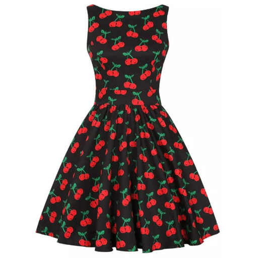 Schwarzes Swingkleid mit Kirschenprint Rocklänge endet oberhalb des Knies V-Ausschnitt am Rücken befestigtes Taillenband verdeckter Reissverschlus...