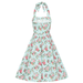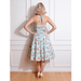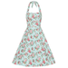 Dieses Swingkleid strotzt nur so vor Retro-Flair mit dem süssen Vintage-Blumenmuster in Rosa und Gelb auf einem Bett aus grünen Blättern und einem wunderschönen blauen Untergrund. Der himmelblaue Untergrund ist mit weißen Punkten verziert, die das Retro-Gefühl verstärken und dem Stil einen wahren Hauch wunderschöner Nostalgie verleihen. Der Neckholder ist verspielt und bequem zu tragen, da er dem Ausschnitt eine strukturierte, quadratische Form verleiht. Das taillierte Oberteil ist mit hübschen Zierknöpfen besetzt und geht in den weit fließenden Swing-Rock über.