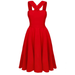 Erlebe deinen Marilyn-Moment mit diesem Kleid in verführerischem Rot. Die gekreuzten Träger lassen sich hinten mit Knöpfen verstellen und verlaufen elegant über den Hals, um einen verspielten Herzausschnitt zu bilden. Das figurbetonte Oberteil verfügt über Wiener Nähte, die über die Brust verlaufen und an der Taille enden – für eine schmeichelhafte Passform. Der ausgestellte Rock sorgt für Volumen und Schwung, und versteckte Taschen in den Seitennähten verstauen deine wichtigsten Utensilien sicher, während du die Nacht durchtanzt.
