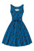 Weit schwingendes Kleid mit schwarzen Katzen auf blauem Grund