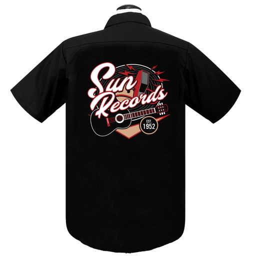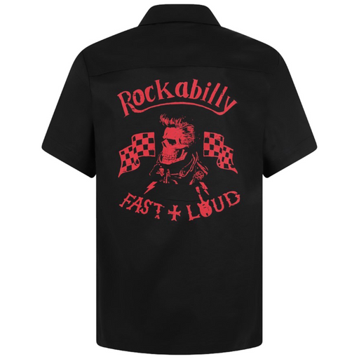 Workerhemd mit grossem Rockabilly-Print auf dem Rücken schwarze Kunststoffknöpfe zwei Brusttaschen Material: 65% Polyester, 35% Baumwolle Rocke a...