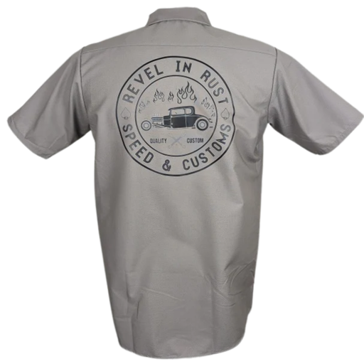 Schwarzes Workerhemd mit coolem Rückenprint Knöpfe aus Kunststoff Material: 65% Polyester, 35% Baumwolle Dieses graue Revel in Rust- Hemd mit sei...
